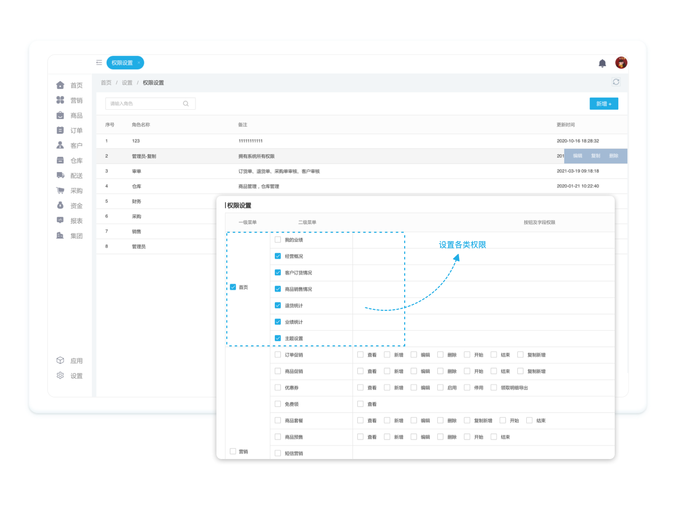 商品管理人员、订单处理人员、库管人员、采购人员、财务人员、销售主管、老板,系统权限都不同,销售业务人员归属的客户数据相互独立,而老板和销售主管可以看到所有业务员客户数据。