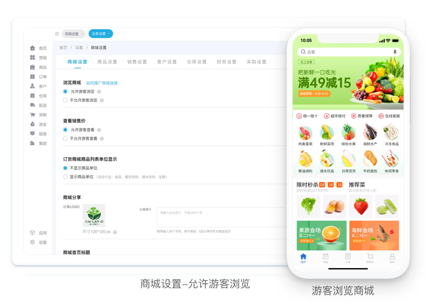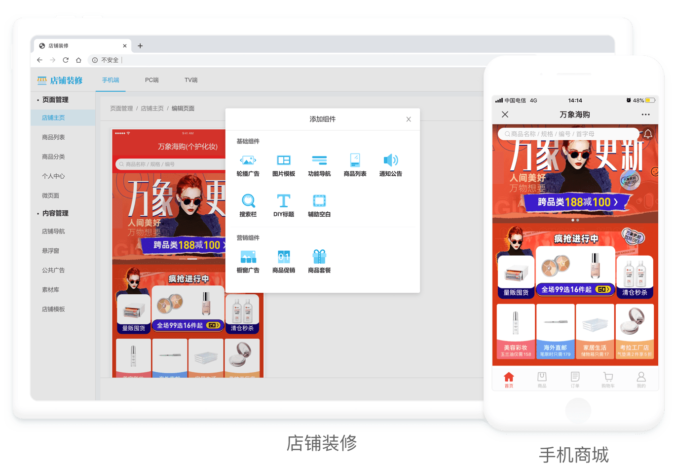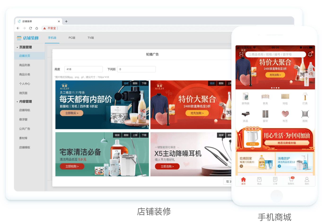 同时支持移动端商城和电脑端商城装修,系统内置10+行业模板,30+装修组件 移动端商城装修效果一键同步小程序商城、微信公众号商城和手机APP商城 企业电脑管理端支持替换LOGO和主题色,彰显企业品牌感。