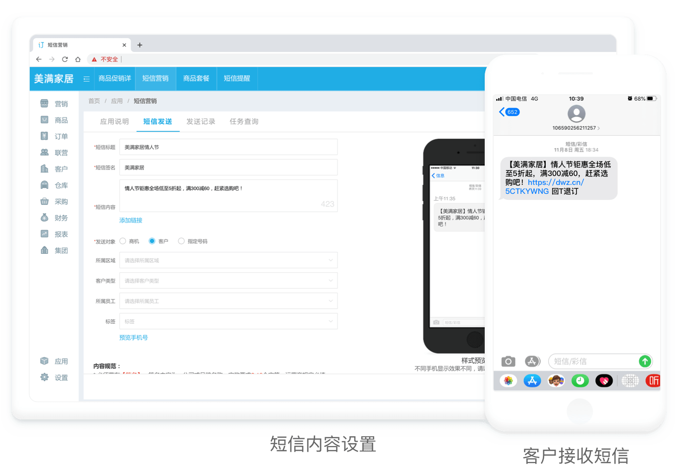 触达率高,价格低,有迹可循; 客户留存,已经合作的客户近期未下单可能导致客户流失,及时推送优惠信息留住客户; 客户关怀,在特殊的节日(春节、中秋节、国庆节等)可以给客户群发短信。