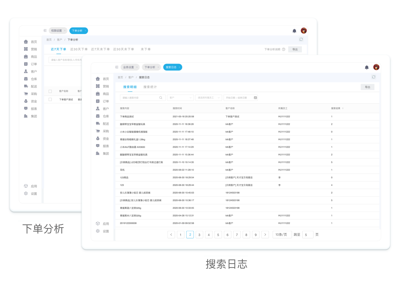 通过查看客户下单汇总情况和近7天/30天未下单客户进行快速跟进了解该客户的下单频率/下单量/最近下单时间/客单价,系统显示存在流失风险的客户,通过客户画像,立体分析客户问题,快速解决,把客户拉回正轨。