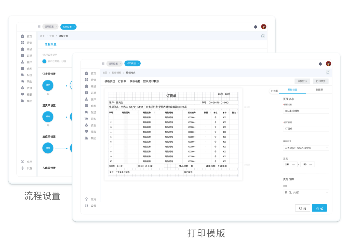 流程自定义配置最符合您企业实际业务协作的流程,10个人以下企业可以采取较少的流程环节,10个人以上企业可以开启更多流程环节,精细化管理 通过打印模板自定义,各种打印纸张规格和尺寸,简单通过拖拽形式,您就能根据所在行业特性和以前送货单的格式,5分钟内设置好打印模板。